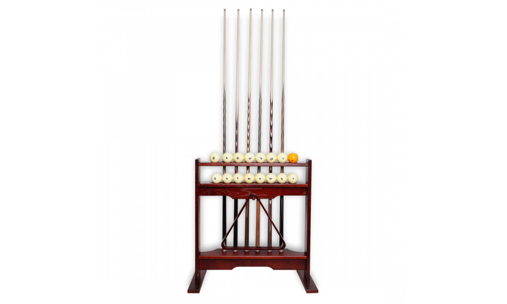 Киевница предназначена для хранения 6 киев в вертикальном положении. Имеются две горизонтальные полочки для хранения бильярдных шаров и крючок для подвешивания треугольника. На полочках предусмотрены ниши для того, чтобы шары не скатывались на пол. Углубления для установки киев обтянуты сукном.